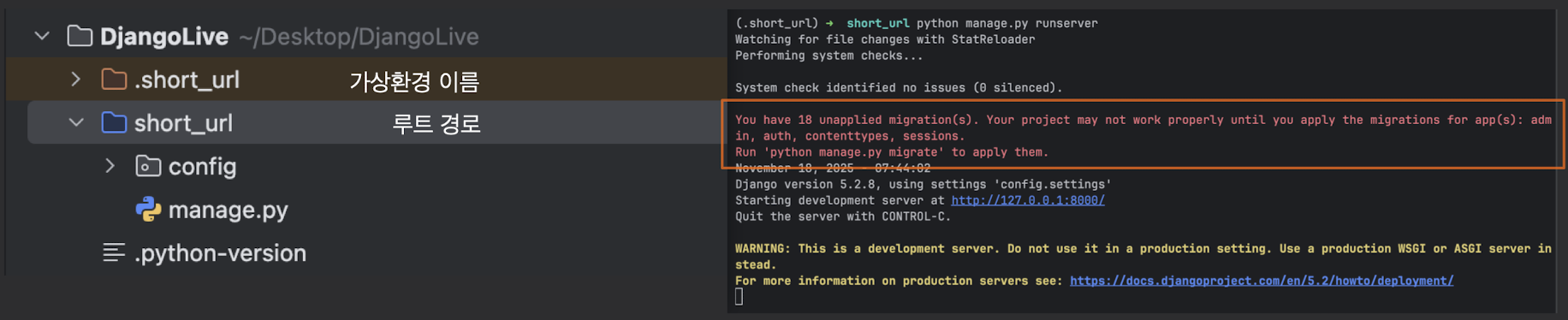 장고의 기본앱을 사용하기 위해서는 마이그레이션을 적용하라는 뜻