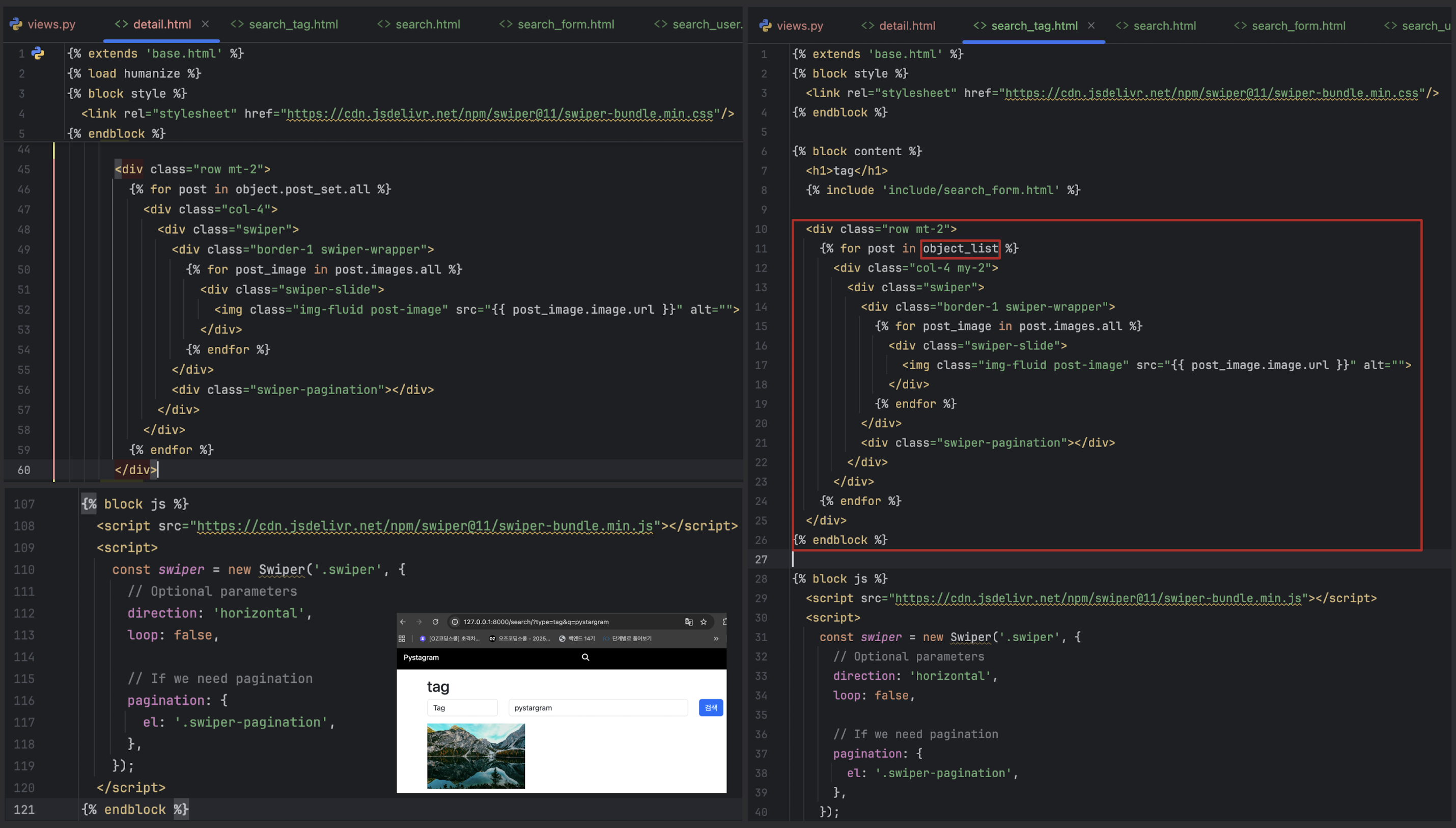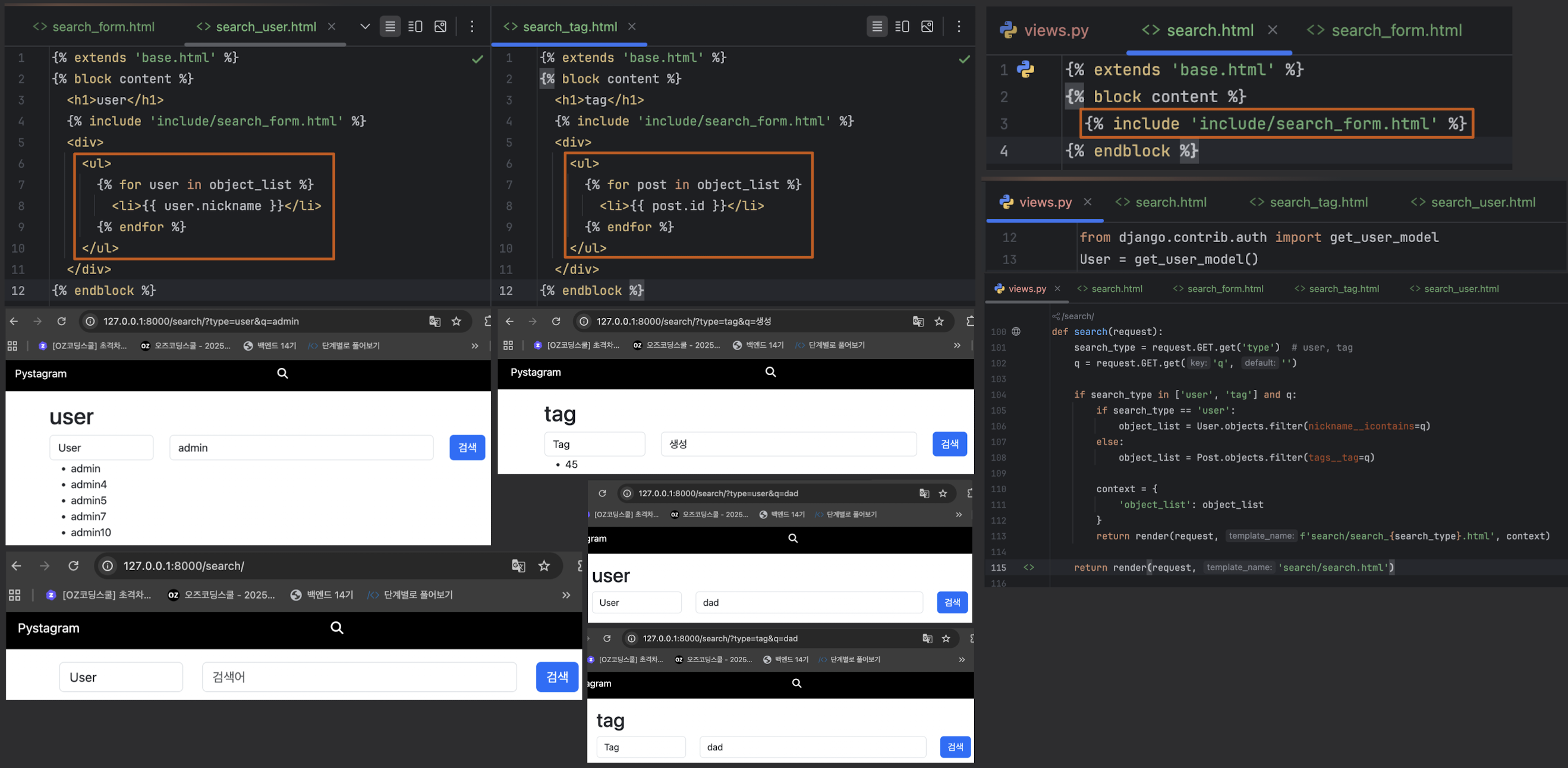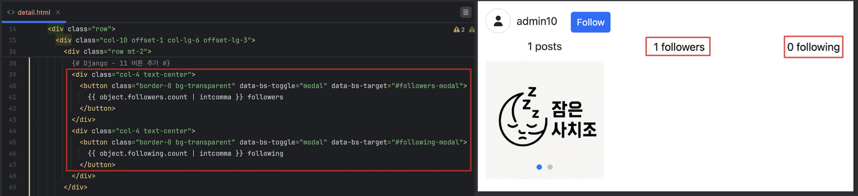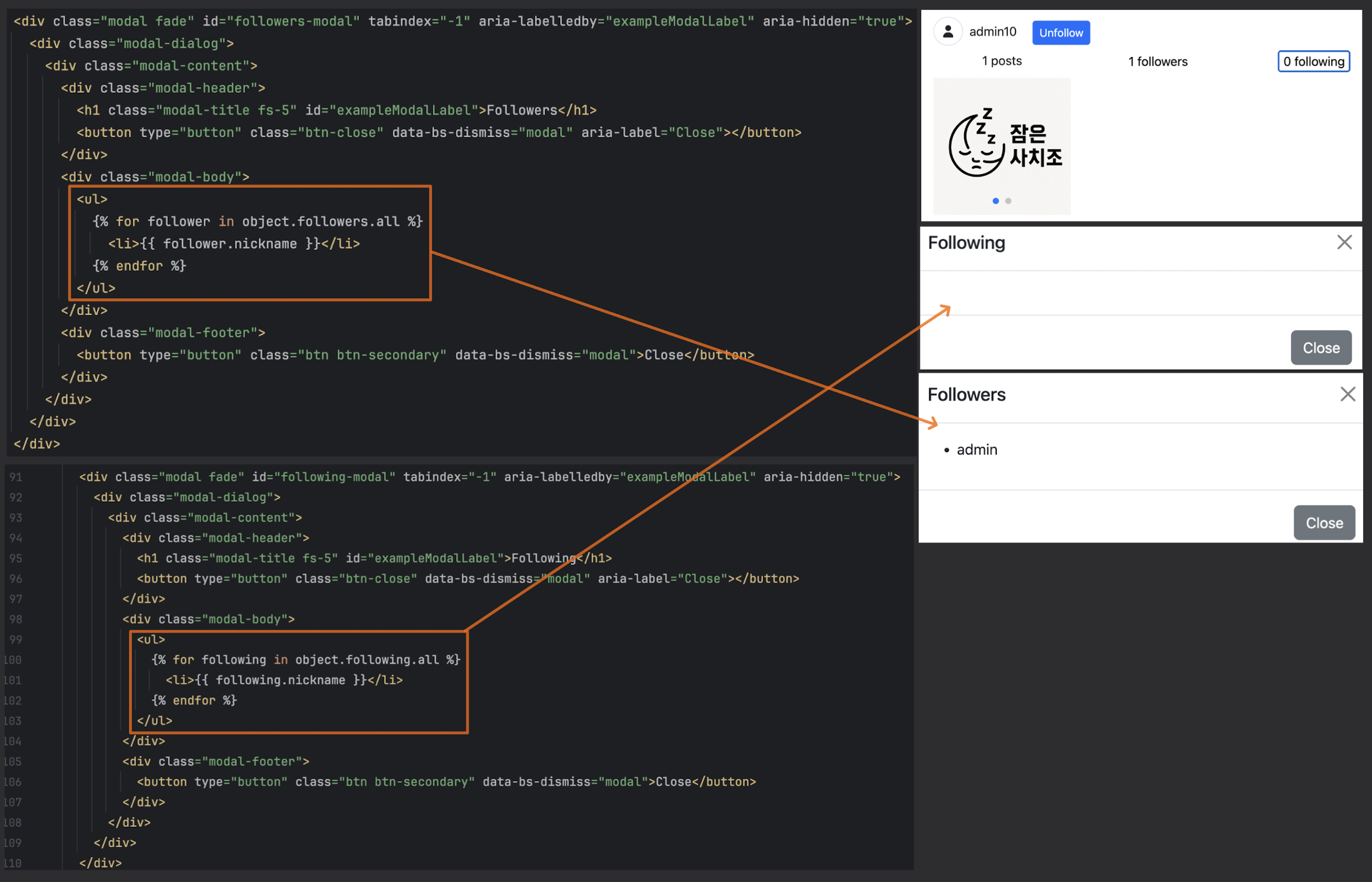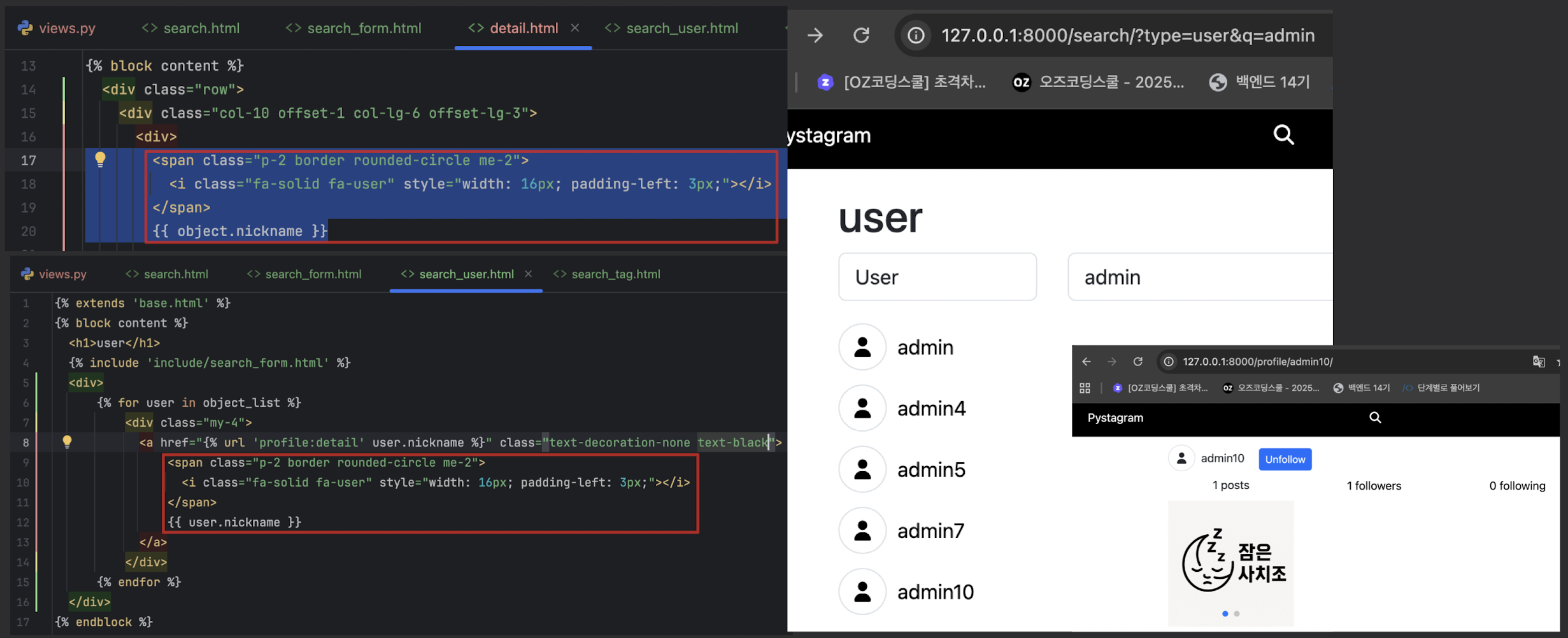 - 수정하지 않으면, follow view 에서 자기 pk 를 못 읽음 → follow 기능 실패