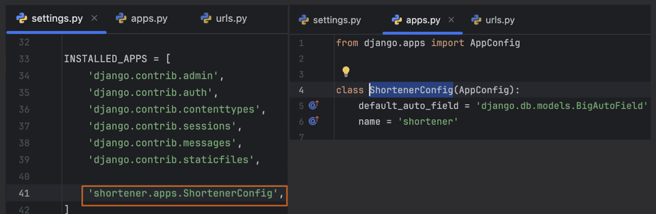 - shortener app를 만들고 만들어진 apps.py 안에 클래스 이름을