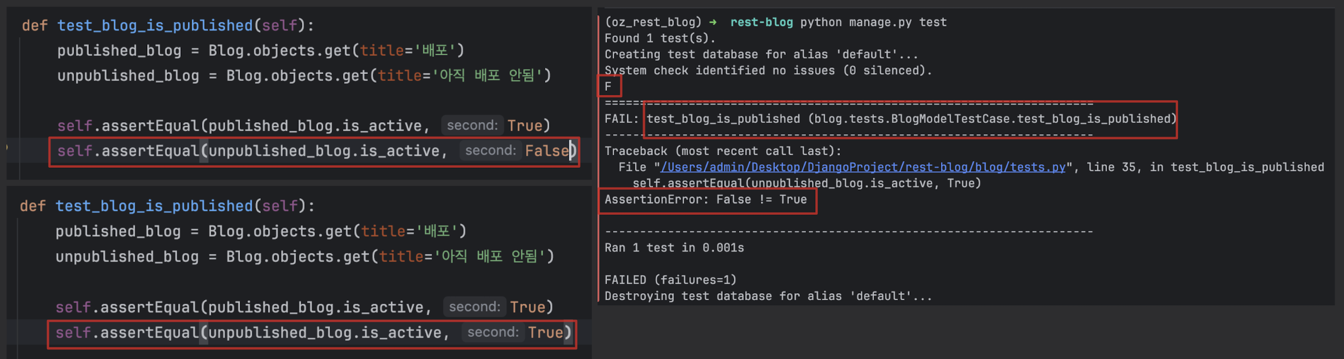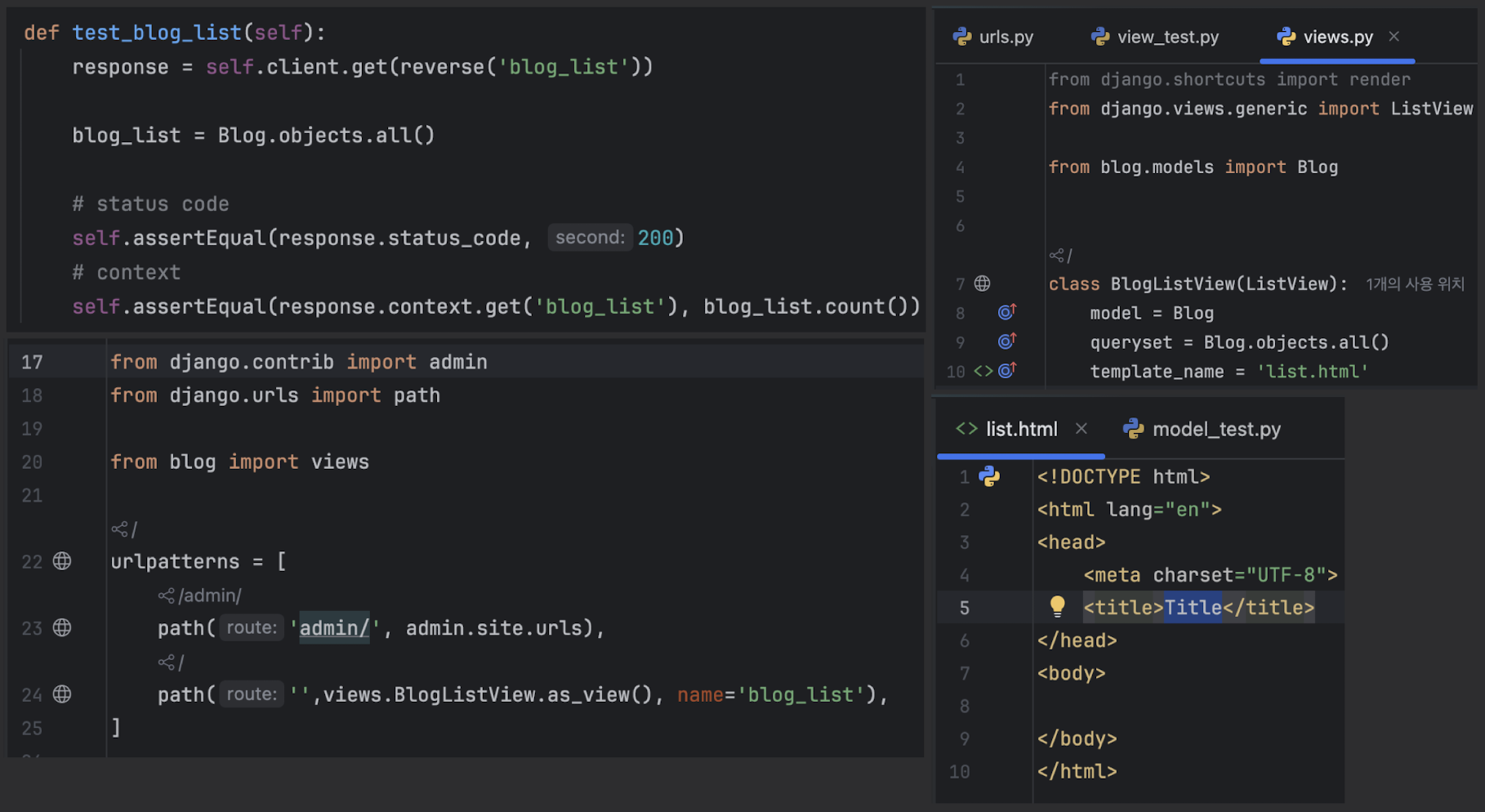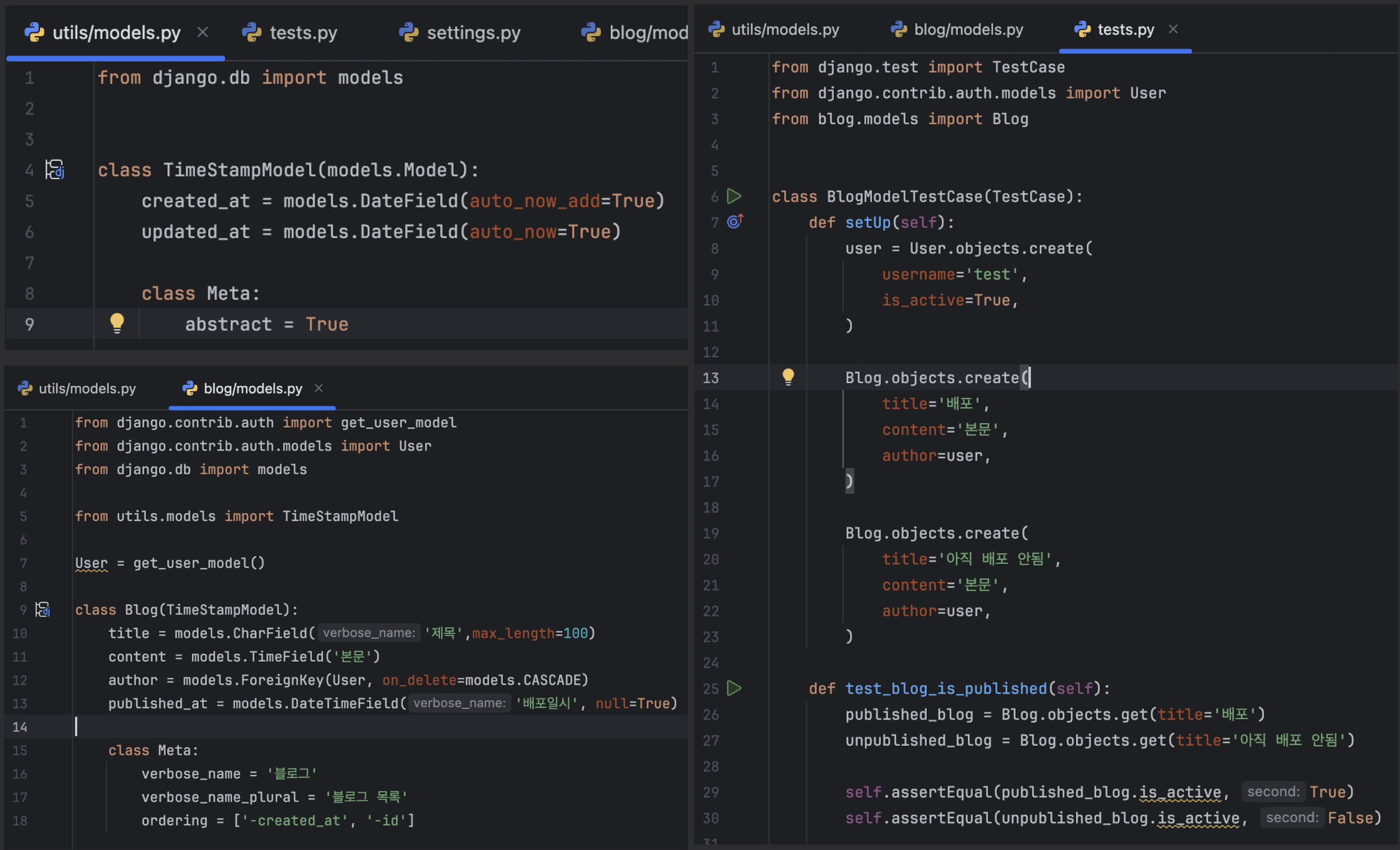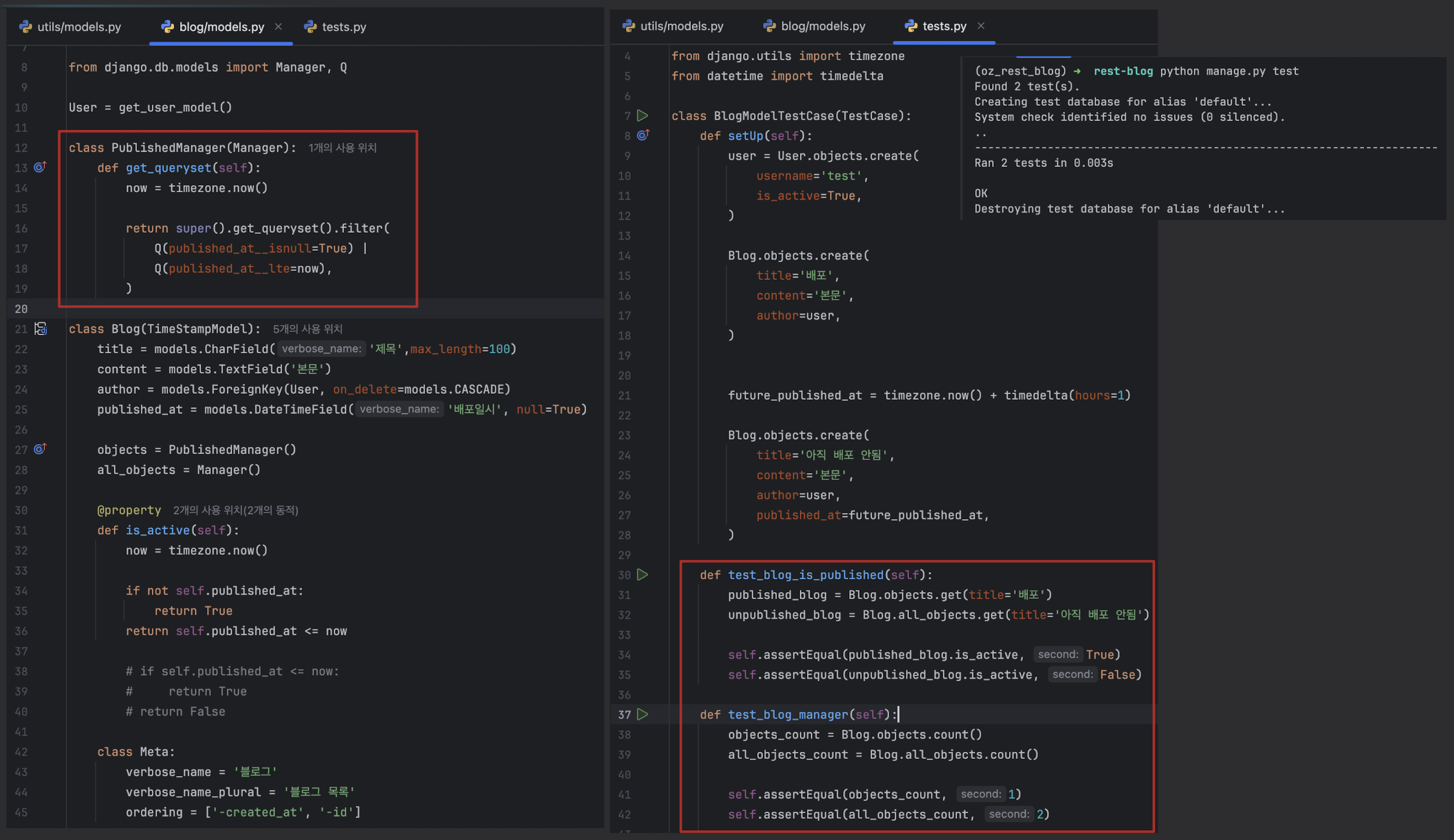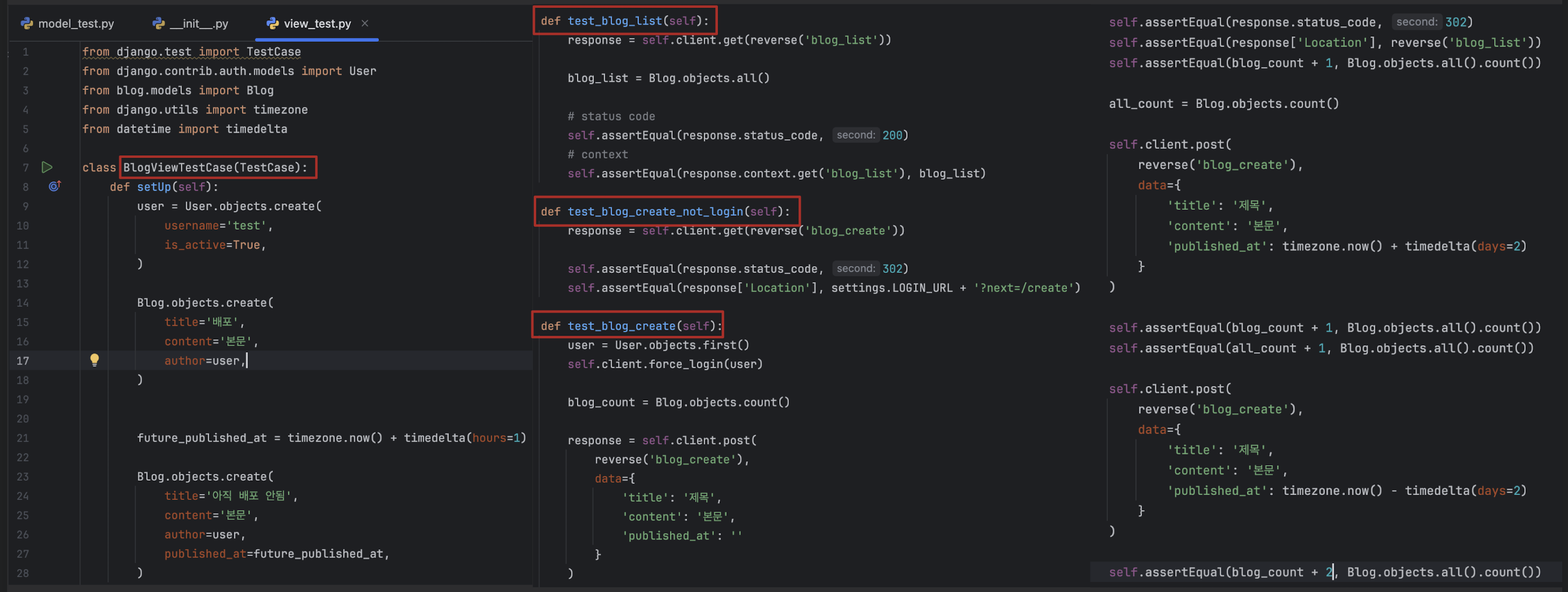 unittest를 기반으로 동작TestCase 또는 APITestCase를 상속받아 작성from django.test import TestCase