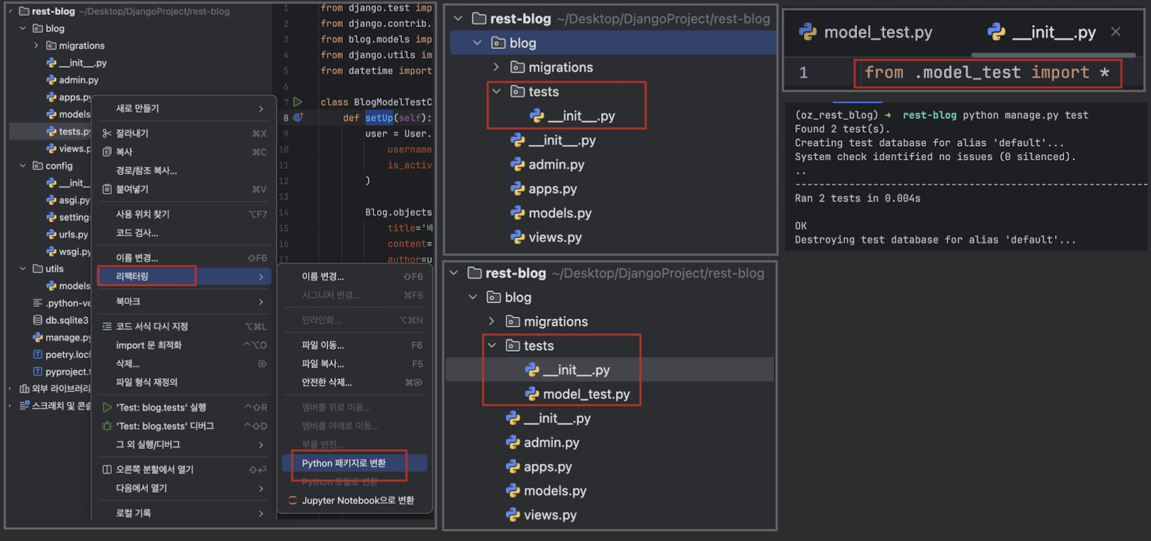 tests.py 에 있던 코드들이 __init__.py로 이동__init__.py를 다시 만들거나 잘라내기 해서 코드를 옮긴다.