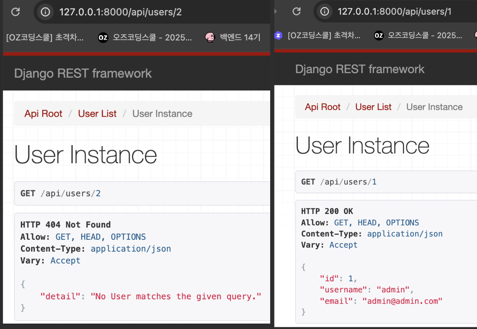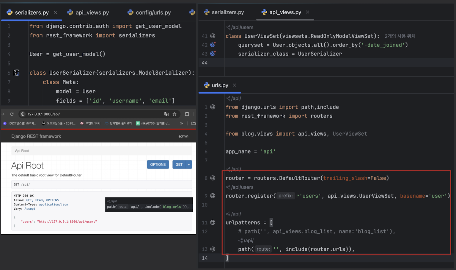 GET /mymodels/ → list 뷰GET /mymodels/{pk}/ → retrieve 뷰POST /mymodels/ → create 뷰PUT /mymodels/{pk}/ → update 뷰DELETE /mymodels/{pk}/ → destroy 뷰DefaultRouter는 SimpleRouter의 기능에 더해, 기본 API 루트 엔드포인트를 추가로 생성 해줌/ 에 API 루트 엔드포인트가 추가되어 사용자가 어떤 엔드포인트를 사용할 수 있는지 쉽게 파악가능rom rest_framework.routers import DefaultRouter