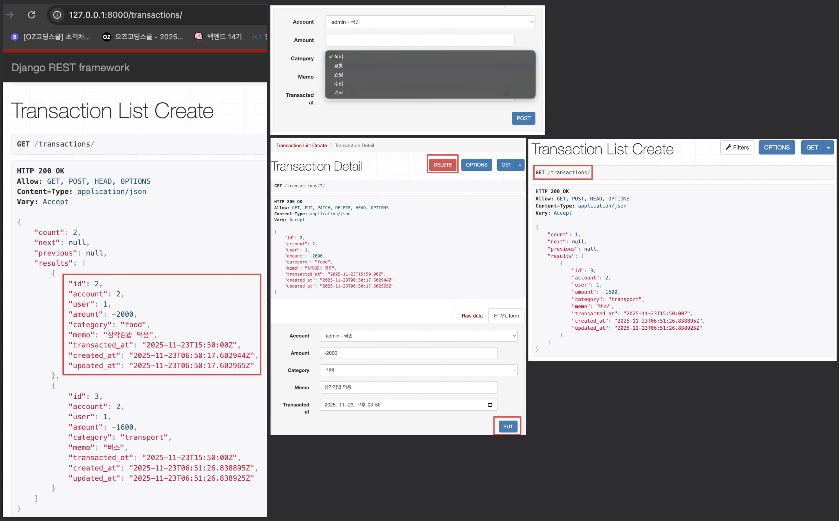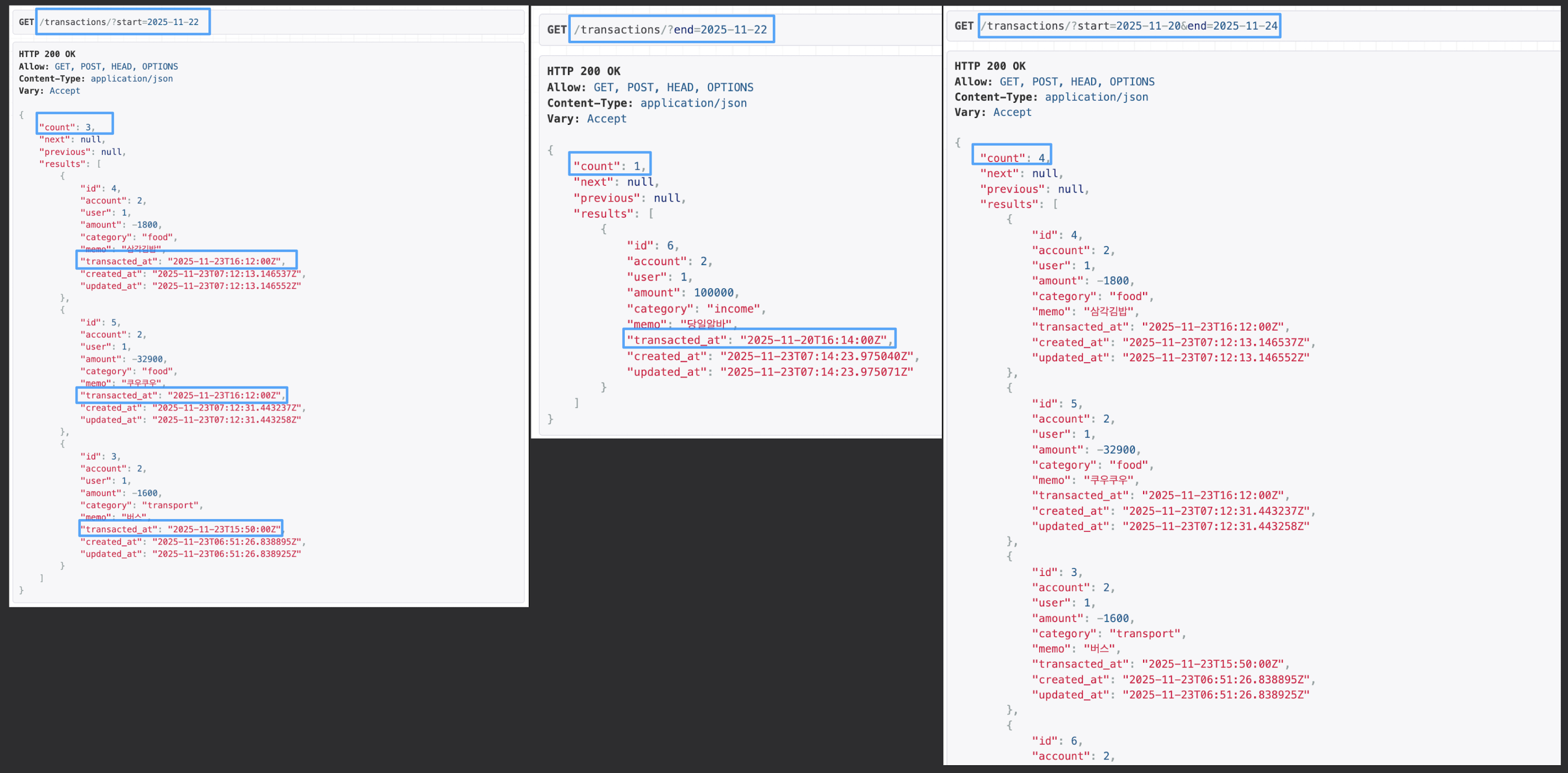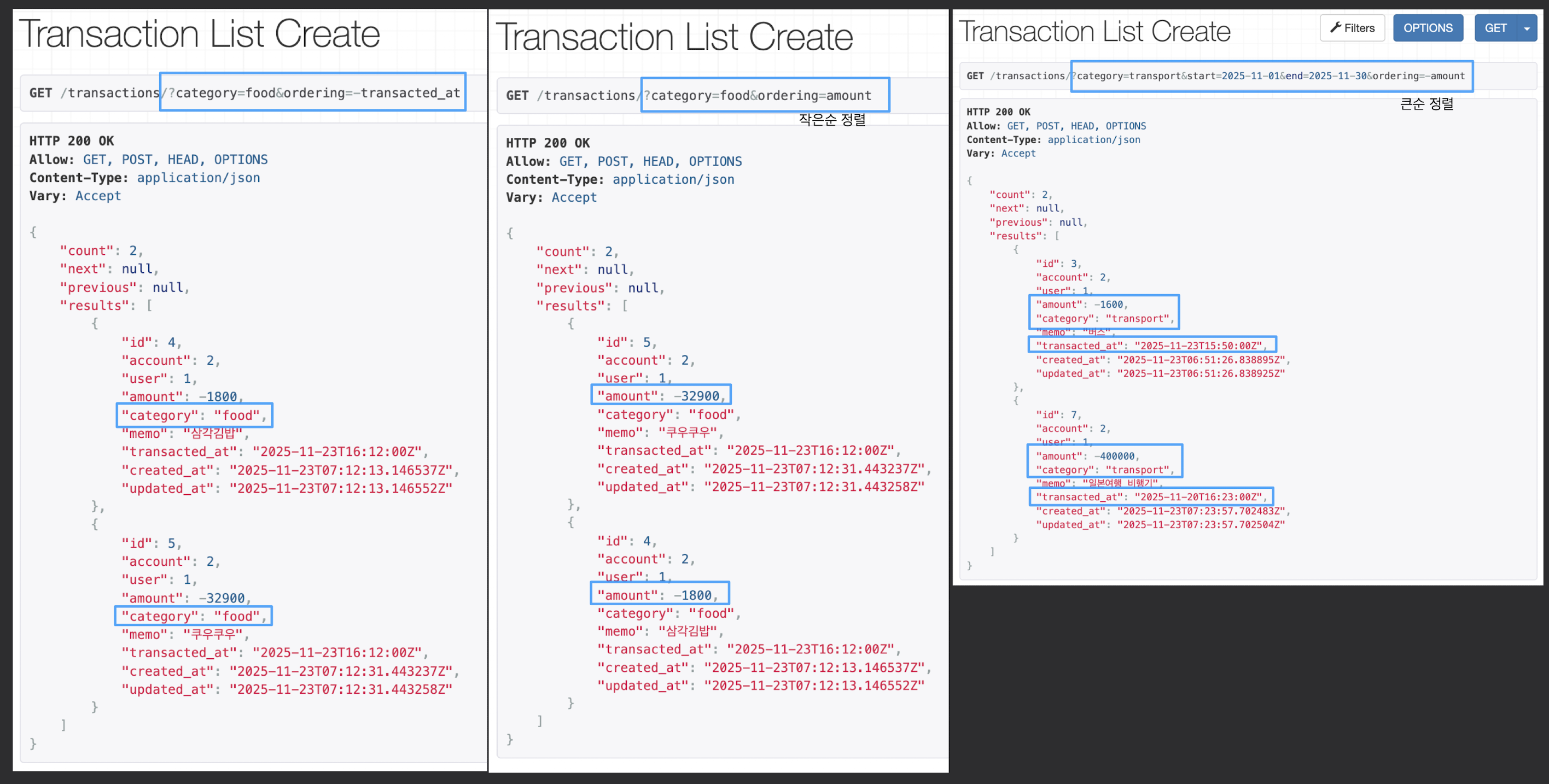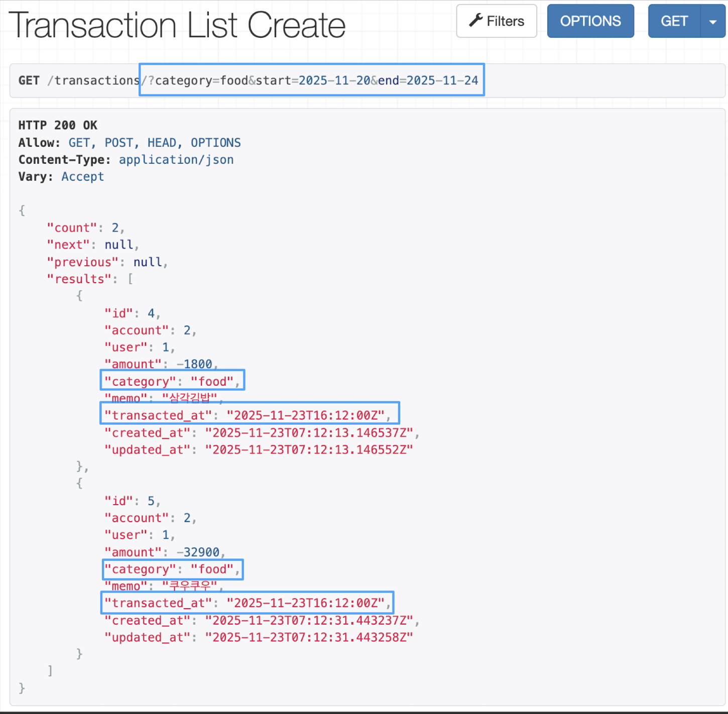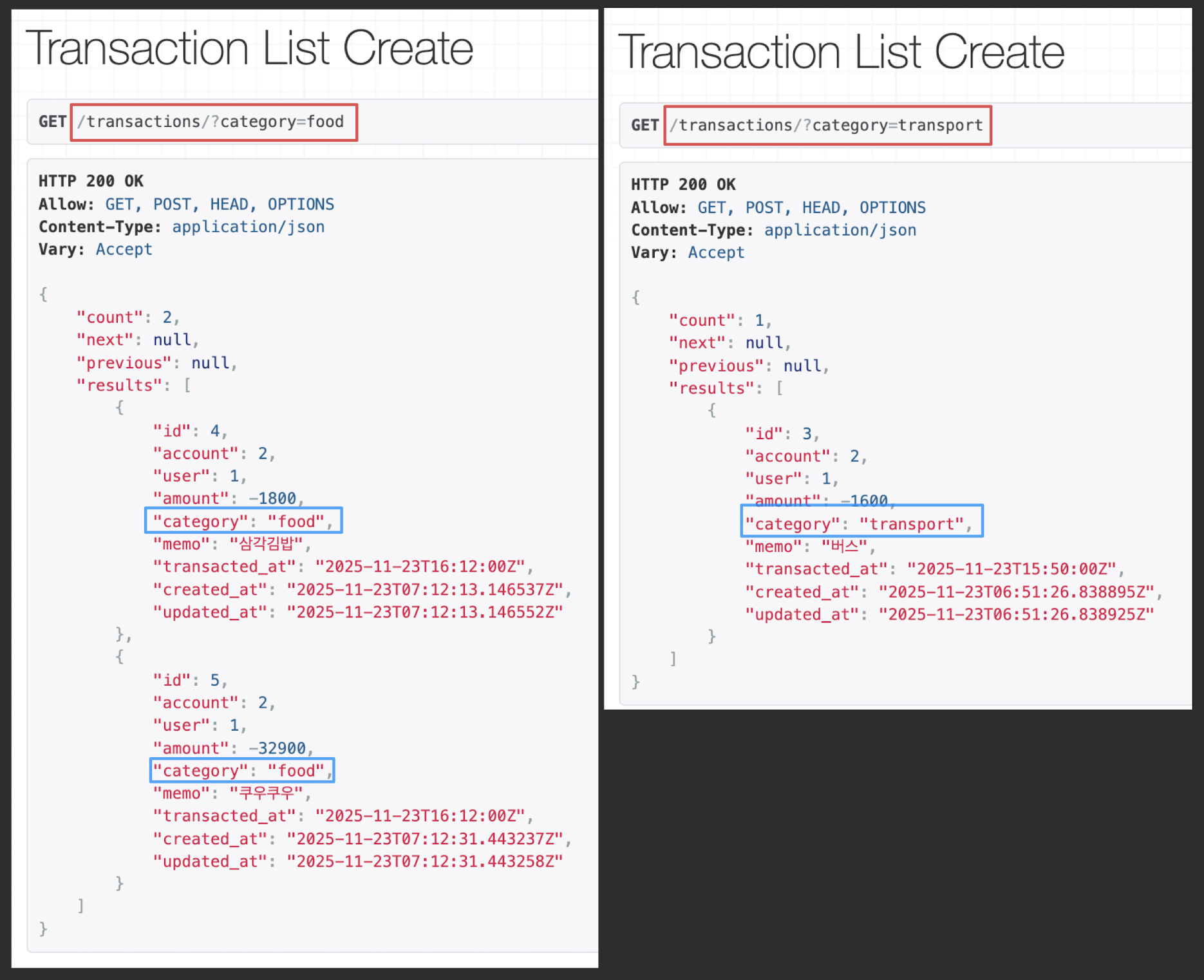 http://127.0.0.1:8000/transactions/?category=food -> 식비만 보기 http://127.0.0.1:8000/transactions/?category=shopping -> 쇼핑만 보기