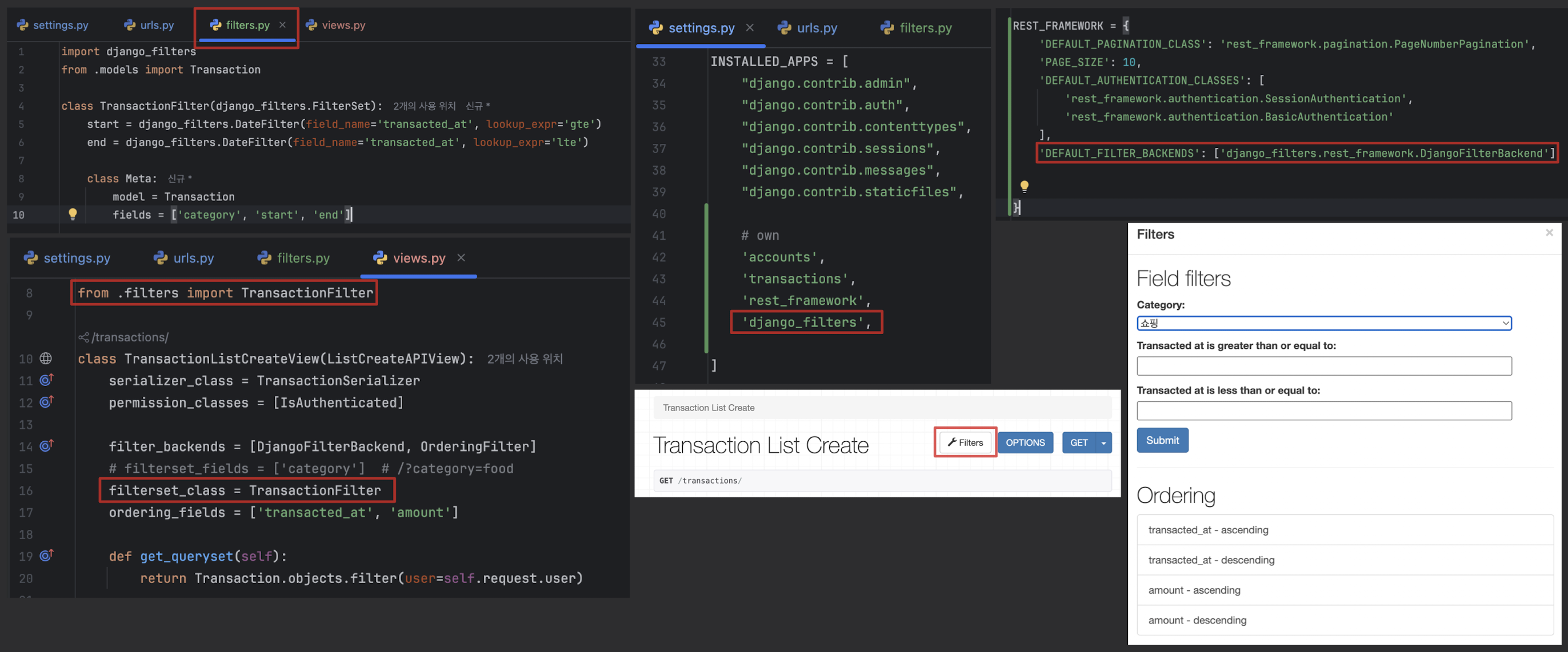 ListCreateAPIView -> 거래 조회 + 생성 APIfilter_backends = [DjangoFilterBackend, OrderingFilter] -> 필터/정렬 백엔드 적용filterset_fields = ['category'] -> /?category=food 필터ordering_fields = ['transacted_at', 'amount'] -> 정렬 필드 허용 def get_queryset(self):