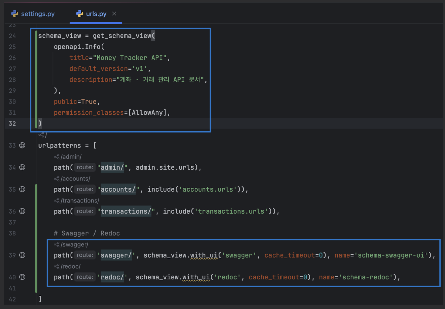 /transactions/?category=food&ordering=-transacted_at/transactions/?category=shopping&ordering=amount/transactions/?category=transport&start=2025-01-01&end=2025-01-31&ordering=-amountpoetry add drf-yasgsettings.py 설정 -> INSTALLED_APPS -> 'drf_yasg'