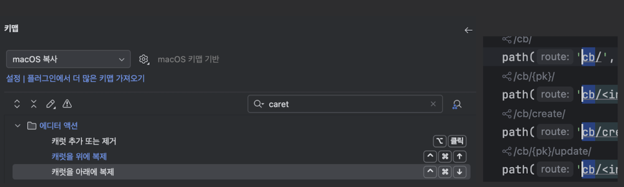 3. pycharm 에서 Command + , -> 키맵 -> caret