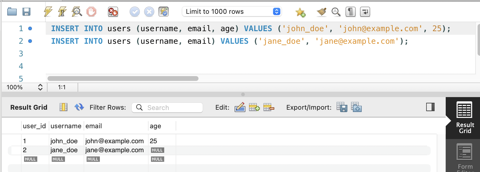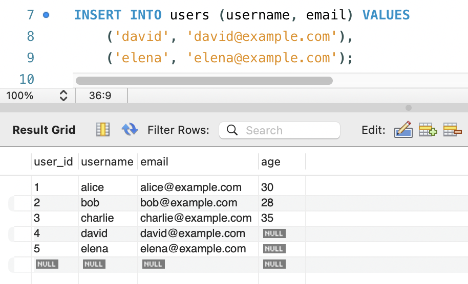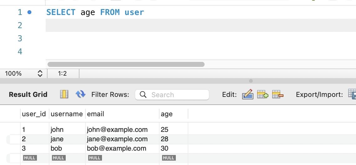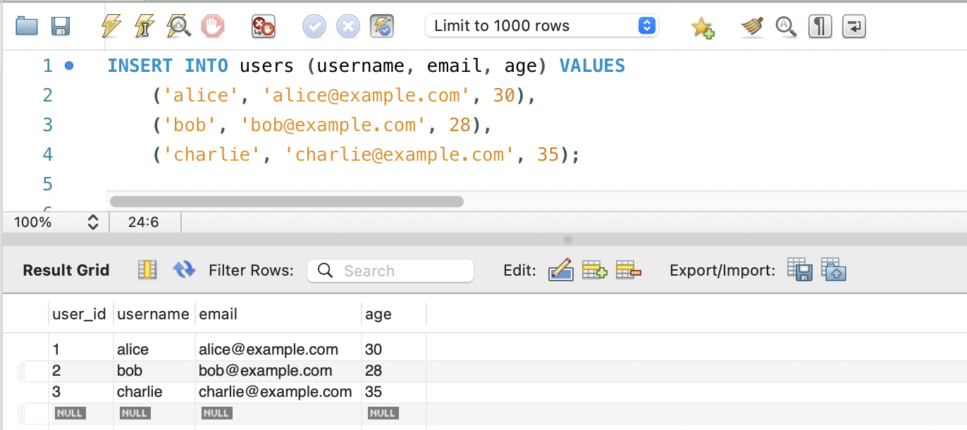 SET username='john', email='john@example.com' : username과 email 컬럼을 새로운 값으로 바꾼다.WHERE age=25; : 나이가 25인 행만 수정한다. UPDATE 테이블명 : 업데이트 할 테이블의 이름