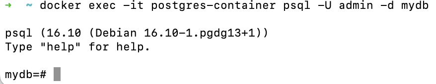 docker run --name postgres-container -e POSTGRES_USER=admin -e POSTGRES_PASSWORD=1234 -e POSTGRES_DB=mydb -p 5432:5432 -d postgres:16| 옵션 | 의미 |