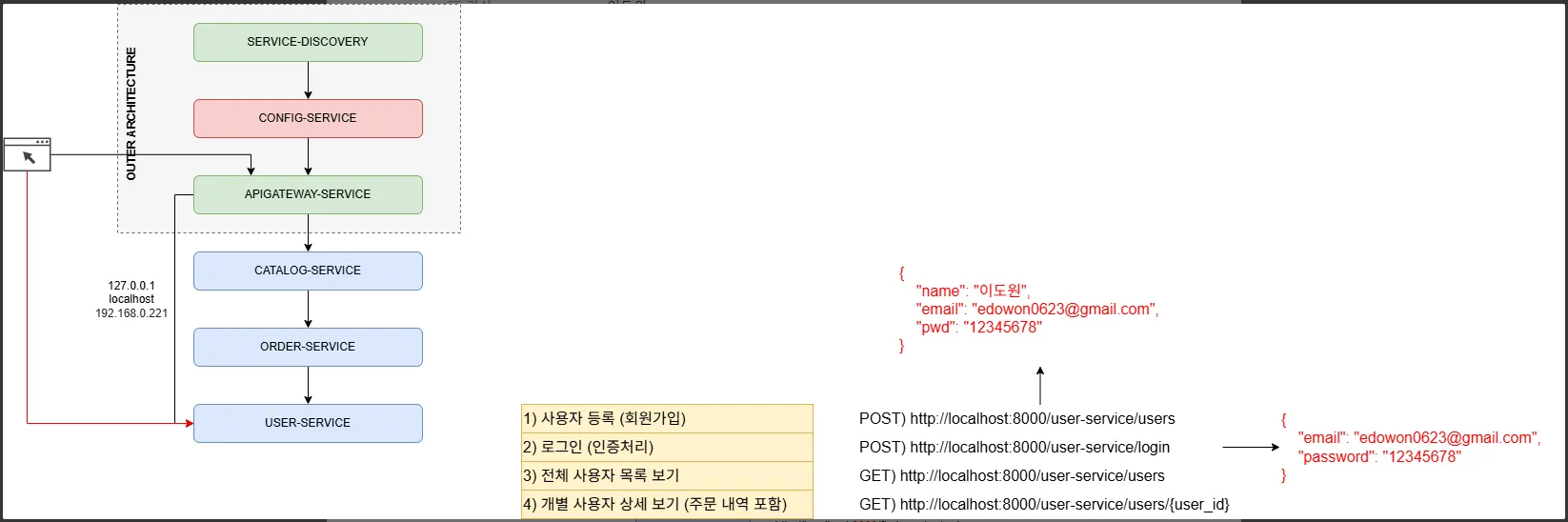 -API Gateway: 클라이언트의 요청을 받아 Eureka에서 서비스 정보를 조회하고, 해당 서비스로 라우팅.