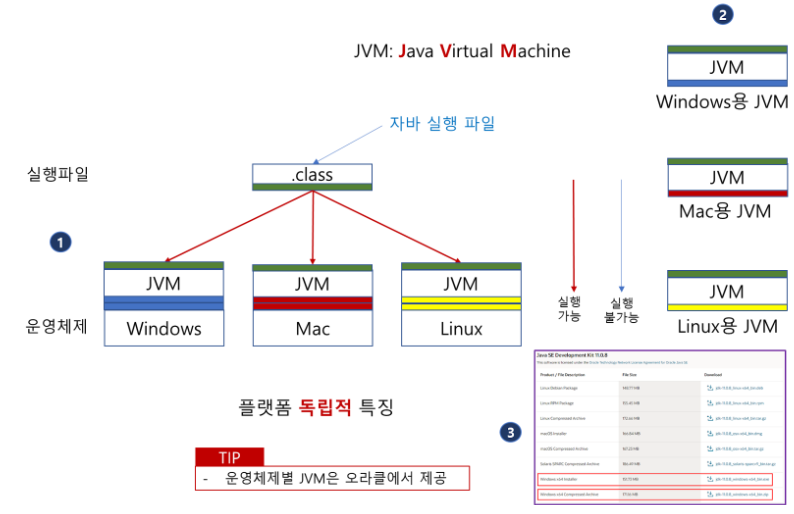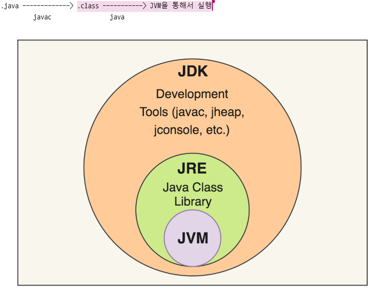 .java단계 까지는 JDK, .class 단계는 JRE 환경에서 동작, JVM을 통해 실행한다.