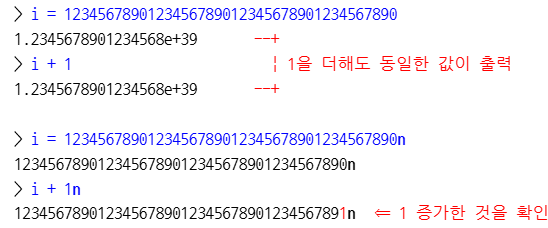 여기서 조금 특이하게 확인해 볼 내용이 있습니다. bigint 자료형으로 선언된 i를 조작한 내용입니다. 1을 추가하고 싶은 경우, i + 1 이 아닌 i + 1n 의 형태로 입력합니다.
