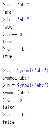 그리고 문자열 비교 시, 문자열의 내용과 자료형을 비교하는 방법이 다릅니다. 문자열의 내용은 (==)의 형태, 자료형 비교는 (===) 로 표현합니다. (===)는 자료형 외에도 문자열 내용까지 비교합니다. 추가로, Symbol은 유니크 한 객체 자체를 비교하는 구문입니다.