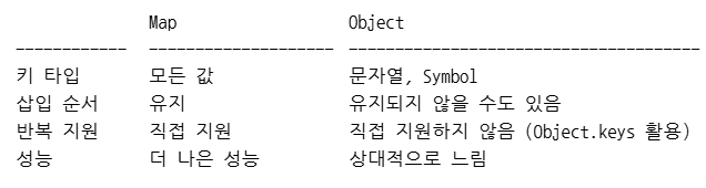 여기서 Map 과 Object의 차이점을 잠시 정리했습니다. Map은 순서가 유지되고, Object는 순서가 유지되지 않는 큰 차이점이 존재합니다.
