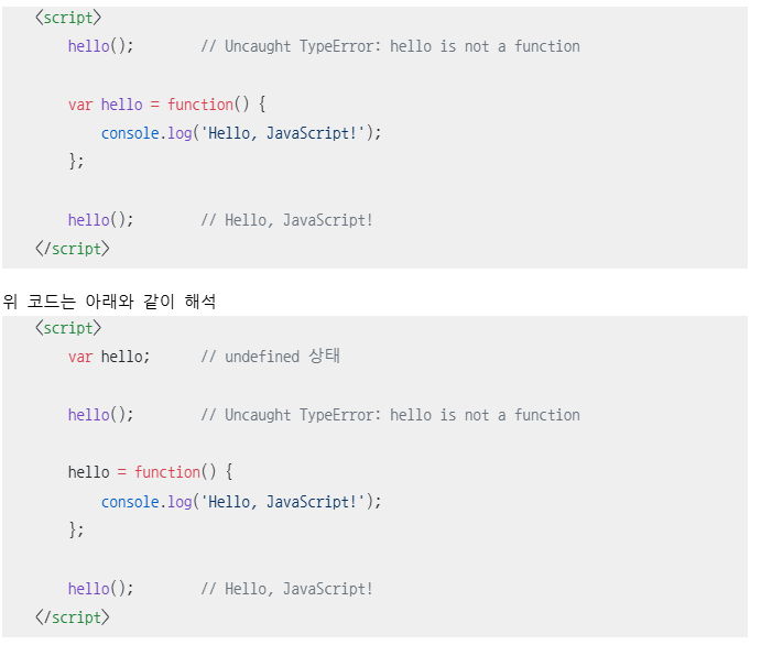 하지만 아래의 경우엔 호이스팅 되지 않습니다. 호이스팅은 선언만 할 뿐, 초기화 기능을 하지 않기때문에 hello() 함수를 연결할 수 없고, var 선언까지만 인식되어 TypeError를 발생시키기 때문입니다.