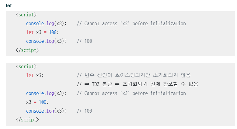 let은 동일 범위({블록} 단위) 내에선 업데이트 될 수 있지만, 다시 선언할 수 없습니다. 이 경우엔 변수 선언은 호이스팅되지만, 값이 초기화될 수 없습니다. 자세히 말하면, 변수는 초기화 되기 전까지 TDZ에 보관되어 참조할 수 없습니다. 따라서 initialization 에러가 발생합니다.