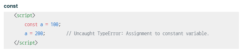 const는 동일 범위({블록} 단위) 내에서만 접근 가능한 변경 불가한 상수 선언형입니다. const도 선언은 호이스팅되지만, 값을 초기화할 수 없습니다. 값 변경 시 typeError가 발생합니다.