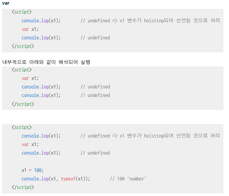 var는 전역 변수라고 할 수 있습니다. 그래서 값이 재선언되거나 업데이트 될 수 있습니다. 그리고 아래의 예시 처럼 실행할 경우 호이스팅이 적용되어 선언된 것으로 처리되고, 값을 초기화하지않은 경우 undefined라고 표시됩니다. 전역 변수이기 때문에, 혹시 다른 코드에서 값이 초기화 된 경우, 의도치 않은 값이 출력될 수 있다는 단점이 있습니다.