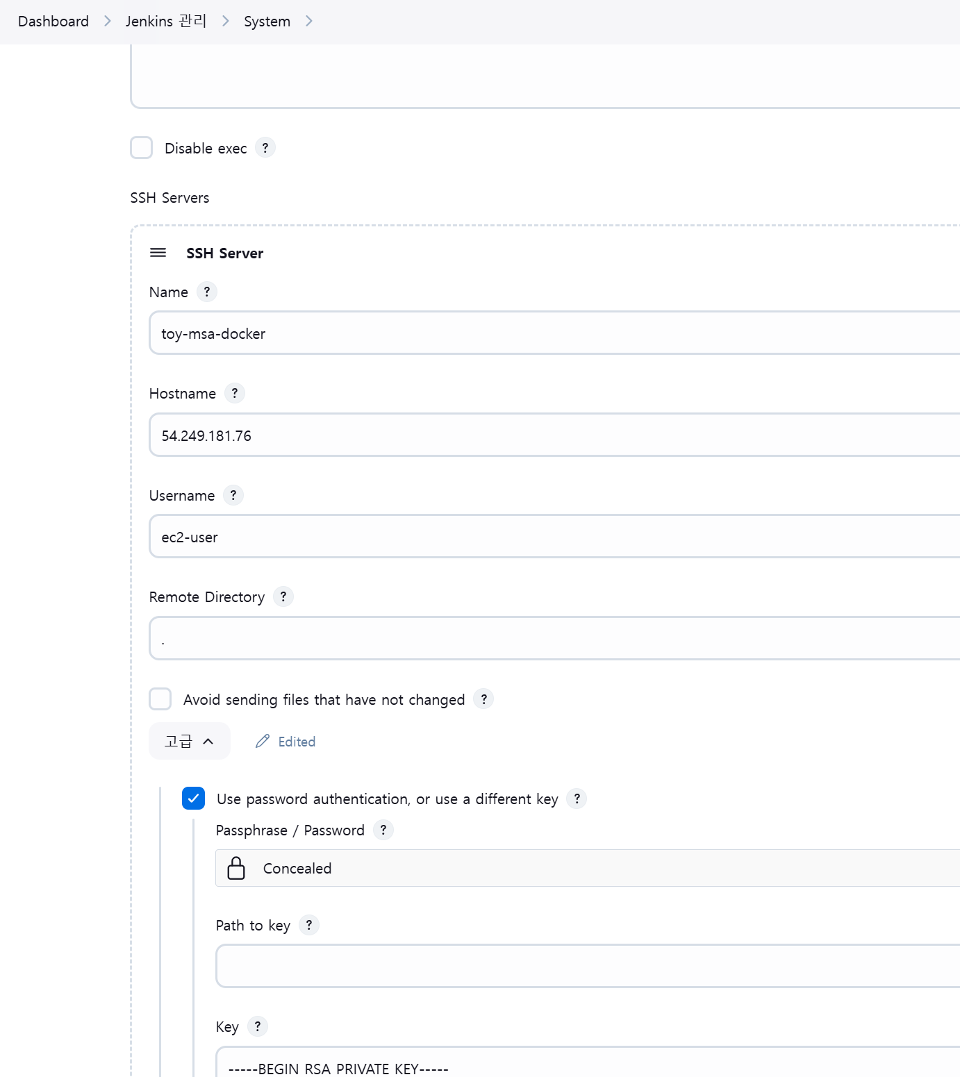 도커 서버의 public IPv4를 호스트네임에 추가, pem key 를 key 에 붙여넣기