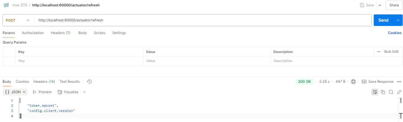 - pom.xml에 actuator 추가, yml에서 endpoints에 exposure 내용 추가 (refresh) -> 단, POST 방식으로 해야함