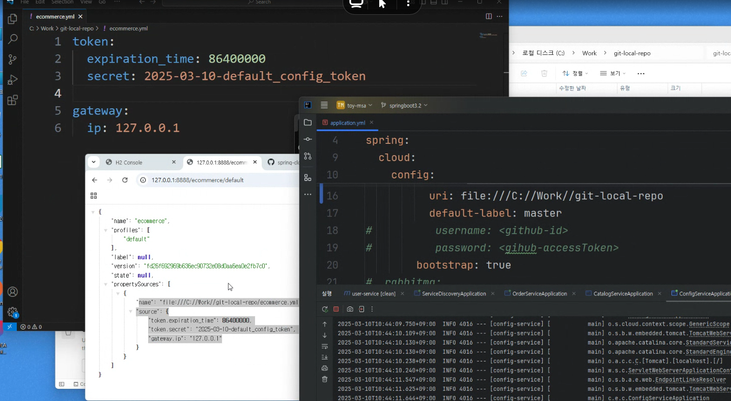 - configServer의 yml 설정 파일에 대해 "uri 값 적용" OR "로컬에서 깃 커밋하여 관리", 2가지 방법으로 실습하였다.