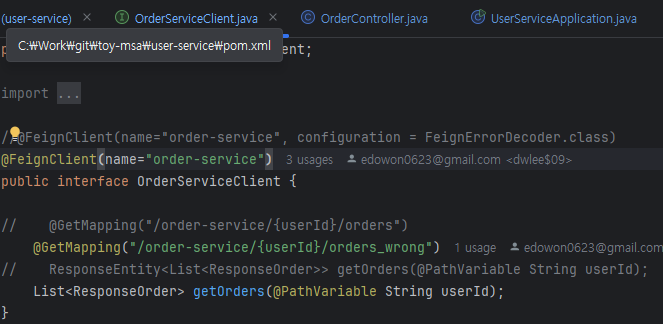 -pom.xml에 의존성 추가, client 파일에서 @FeignClient 명시된 인터페이스 추가