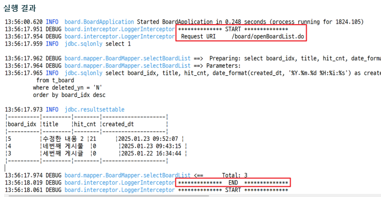 현재 로그 설정 상태에서도 쿼리문의 구조, 적용할 값, 결과가 로그로 출력되는 것을 확인