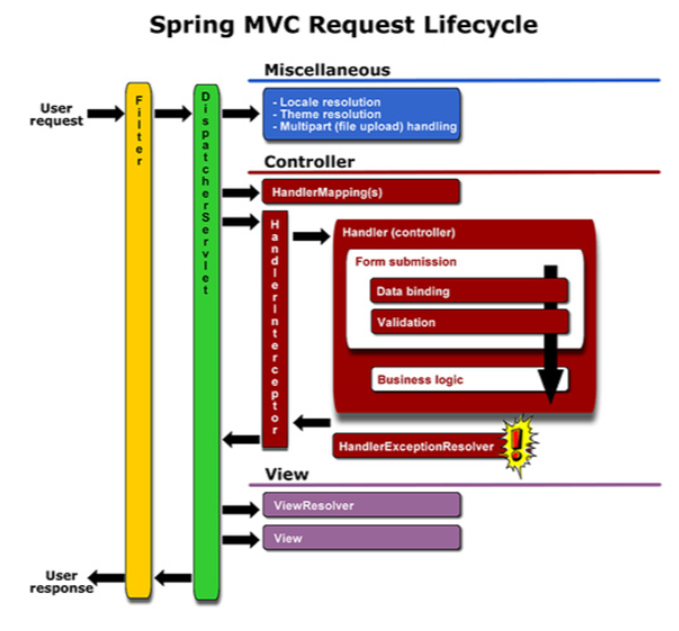 주로 요청 전후에 공통된 작업을 실행하거나, 요청을 처리하는 컨트롤로로 가기 전에 요청을 변경 또는 검사할 때 사용 .