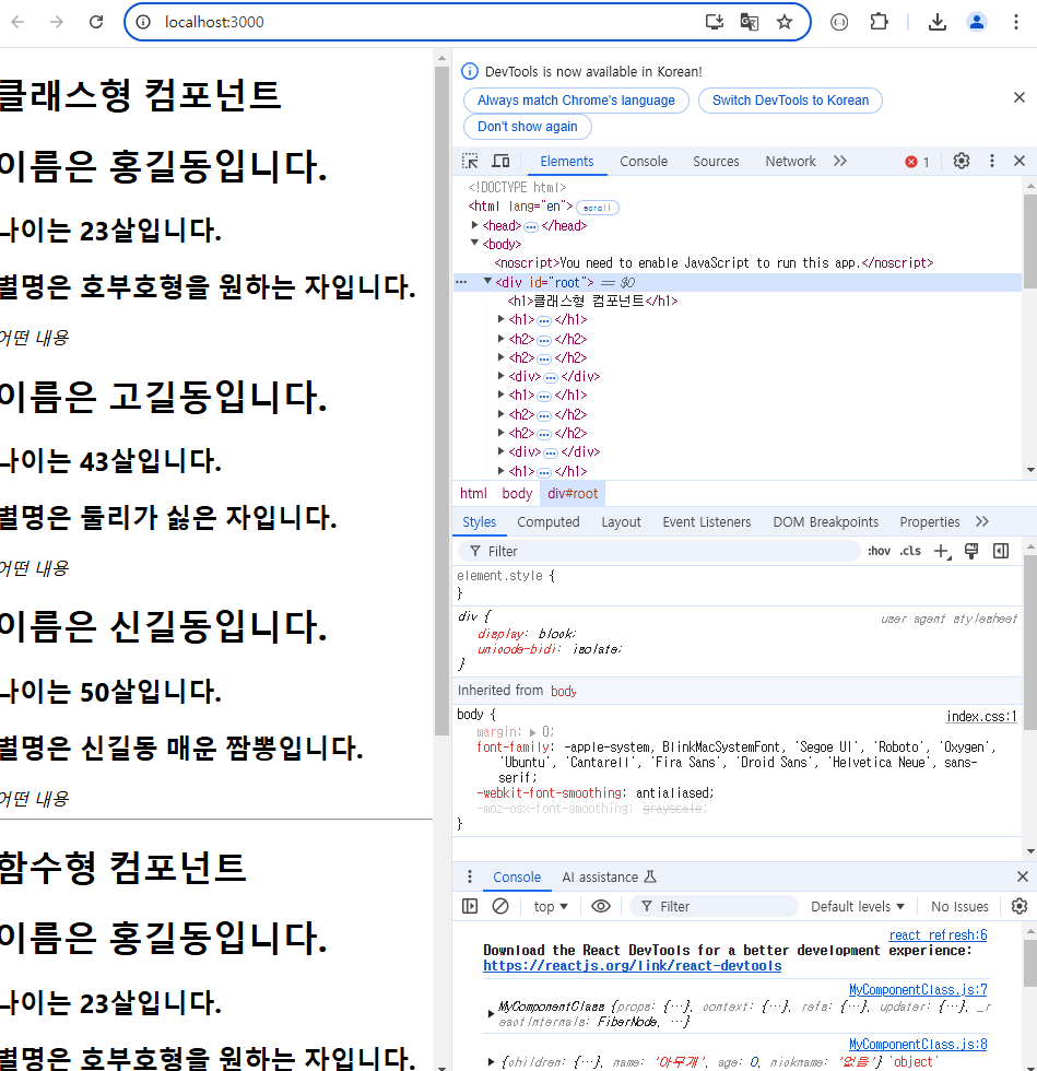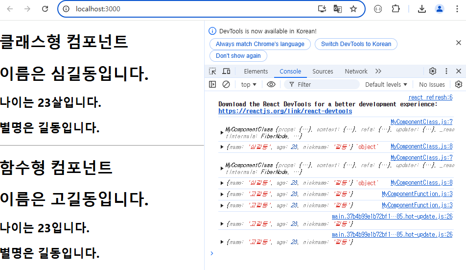 <MyComponentClass name="신길동" age={23} nickname={"길동"} />