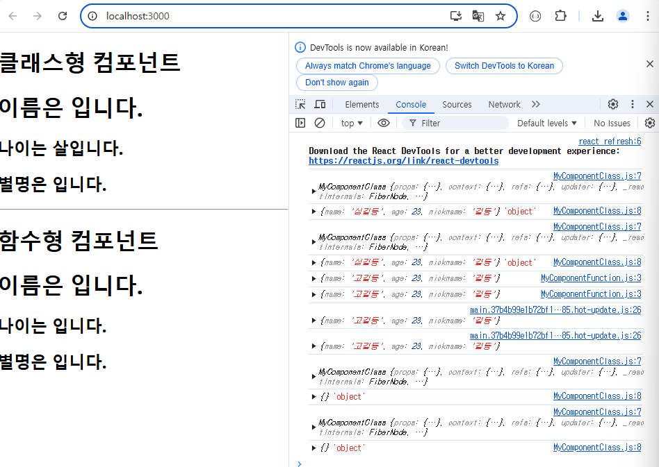 <MyComponentFunction name="고길동" age={40} nickname="길동" />