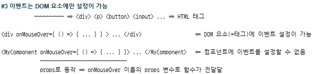 부모 컴포넌트에서 정의한 함수를 자식 컴포넌트의 props 변수로 전달, 해당 함수를 자식 컴포넌트에서 이벤트 핸들러로 지정
