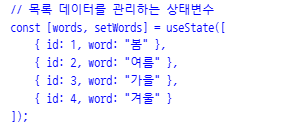 위와 같이 state 변수와 파란 부분 문법이 같이 묶여 다녀야 함.