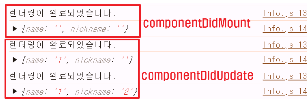 순서 : 마운트(ComponentDidMount) -> name 업데이트(ComponentDidUpdate) -> nickname 업데이트