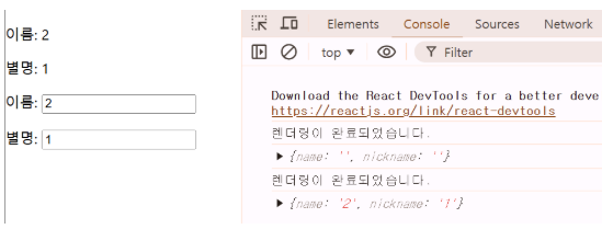<p>별명: <input type="text" name="nickname" value={nickname} onChange={changeNickname} /></p>