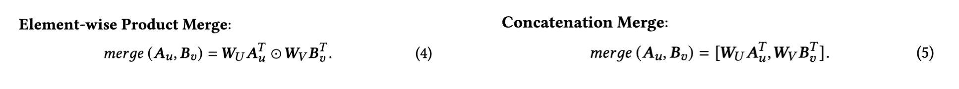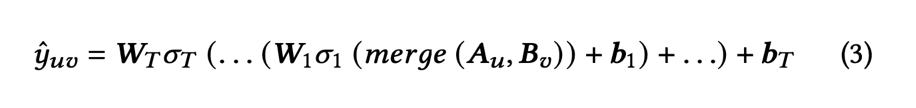 여기서 sigma = non-linear activation function, merge = user-feature & item-feature vectors를 merge하는 함수이다.