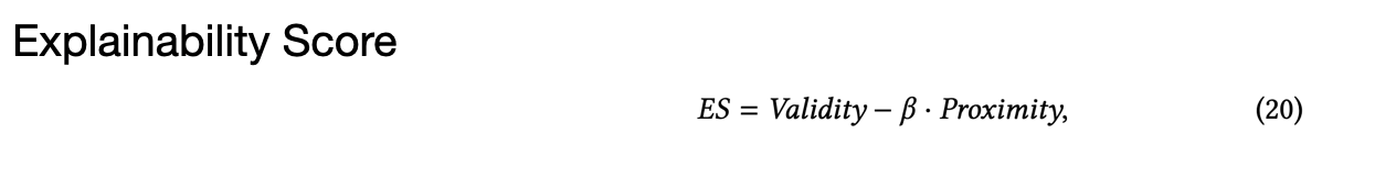아래와 같이 proximity, validity를 정의하여 최종적으로 explainability score (설명가능성 점수)를 얻는다.