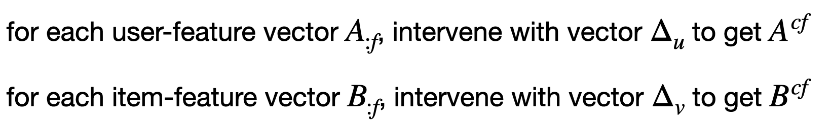 그 후, 각 유저-피처 벡터 A:f에 대해, 작은 개입을 통해 새로운 행렬 Acf를 얻는다.