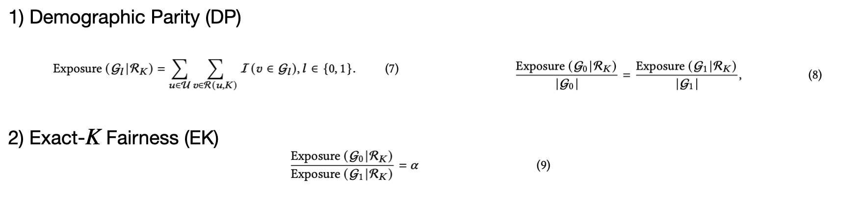 그리고 demographic parity, exack-K fairness라는 popularity bias와 관련된 두 개의 유명한 algorithmic 공정성 정의를 사용한다.