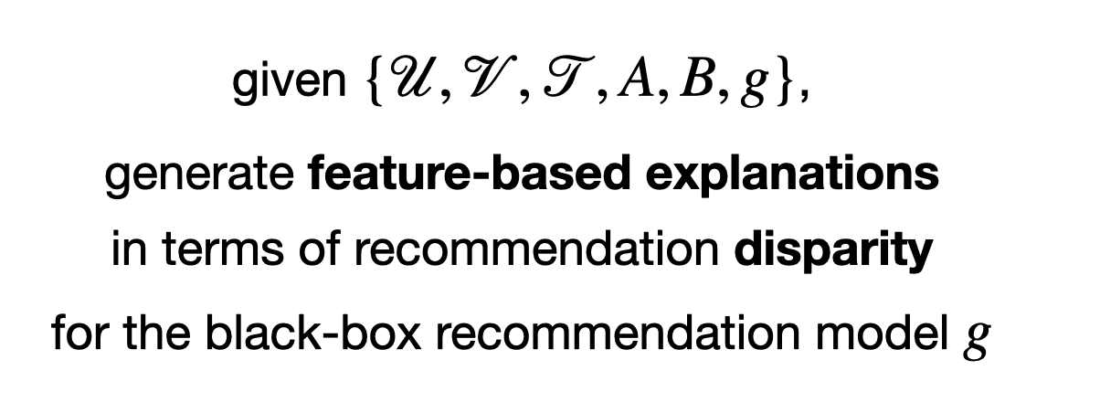 즉, {유저, 아이템, 유저-아이템 관계, 유저-피처 attention 행렬, 아이템-피처 quality 행렬, 랭킹 함수} 가 주어졌을 때, 블랙박스 추천 모델 g에 대해 추천 시스템의 불균형과 관련하여 feature 기반의 설명을 생성하는 것이다.