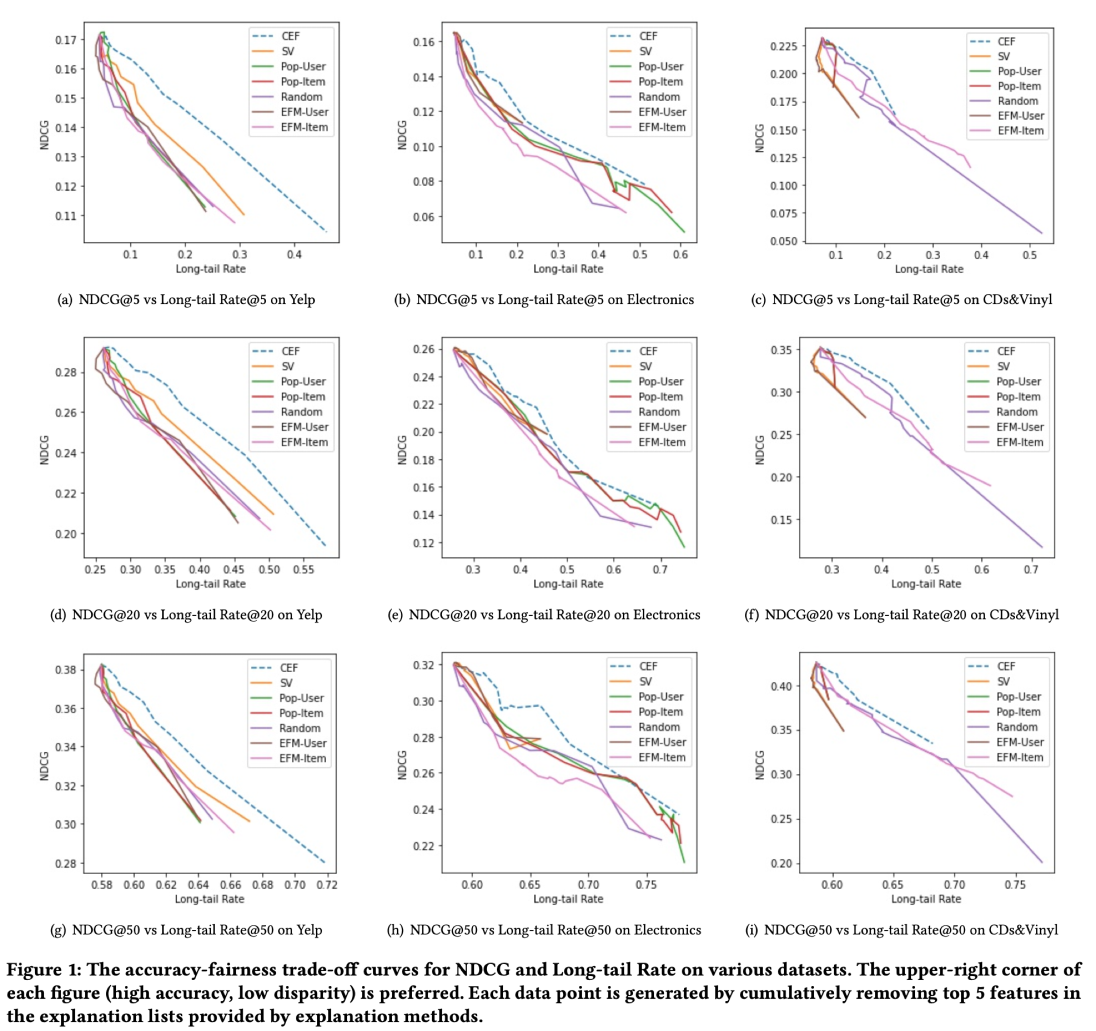 거의 모든 경우에, 논문에서 제안된 CEF (파란 점선)가 가장 좋은 trade-off를 보였다. (오른쪽 위에 가장 가까움)