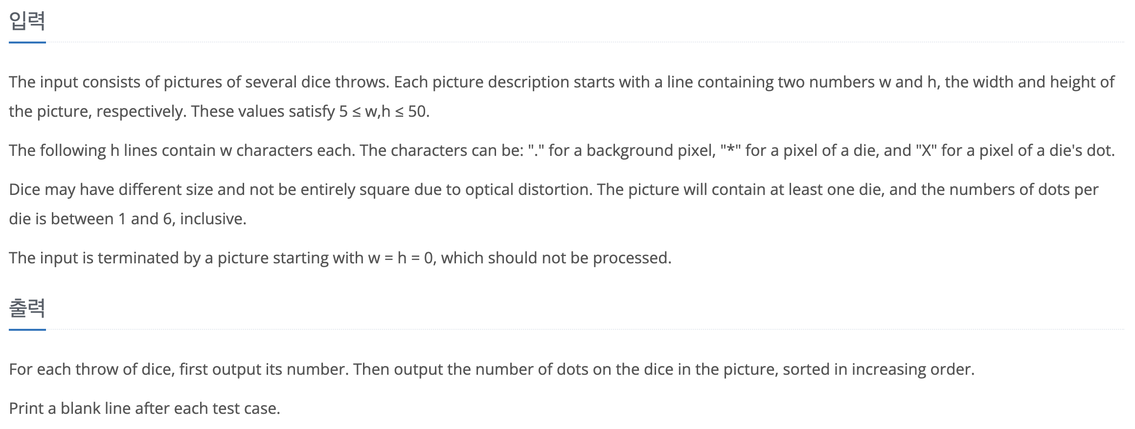 주사위는 크기가 다를 수 있으며, 광학적 왜곡으로 인해 완전히 정사각형이 아닐 수도 있습니다. 사진에는 최소 하나의 주사위가 포함되며, 각 주사위의 점 개수는 1에서 6 사이입니다.입력은 w = h = 0으로 시작하는 사진으로 종료되며, 이 사진은 처리하지 않아야 합니다.