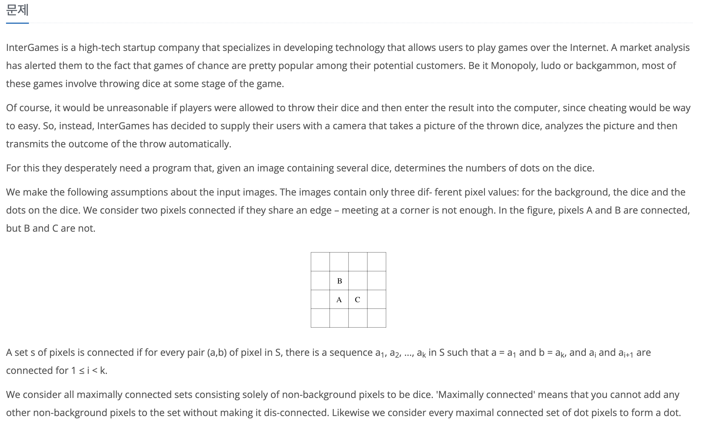입력 이미지에 대해 다음과 같은 가정을 합니다. 이미지는 배경, 주사위, 주사위 위의 점이라는 세 가지 픽셀 값만 포함하고 있습니다. 두 픽셀이 동일한 가장자리를 공유하면 연결된 것으로 간주합니다. 코너에서 만나는 것은 연결로 간주하지 않습니다. 그림에서 픽셀 A와 B는 연결되어 있지만, B와 C는 연결되어 있지 않습니다.