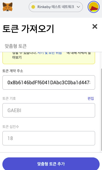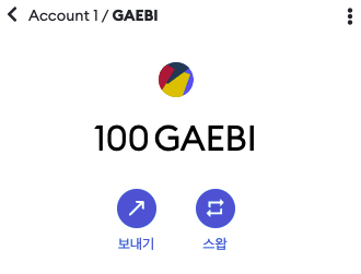 컨트렉트의 주소를 지갑에 임포트를 하면 다음과같이 GAEBI 토큰의 정보가 뜬다.