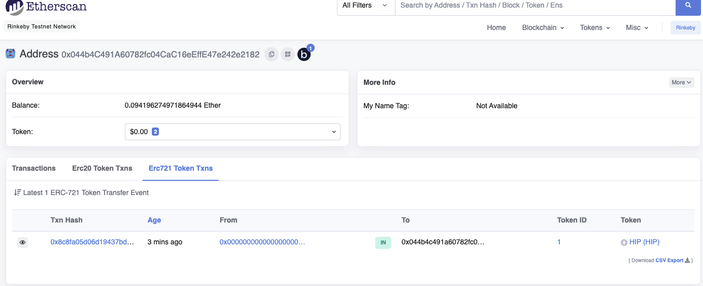 stake 버튼을 누르면 NFT TokenId 1이 넘어가게 될 것이다.