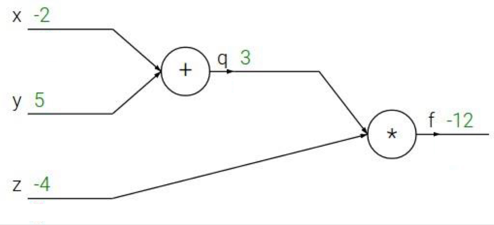 2-2. f를 z에 대해 편미분합니다. f=qz입니다.∂z∂f=∂z∂qz=q=3 2-3. f를 q에 대해 편미분합니다.∂q∂f=∂q∂qz=z=−4 2-4. f를 y에 대해 편미분합니다. q=x+y입니다. (chain rule 적용)∂y∂f=∂y∂q×∂q∂f=∂x∂(x+y)×∂q∂f=1×−4=−4 2-5. f를 x에 대해 편미분합니다. (chain rule 적용)∂x∂f=∂x∂q×∂q∂f=∂x∂(x+y)×∂q∂f=1×−4=−4