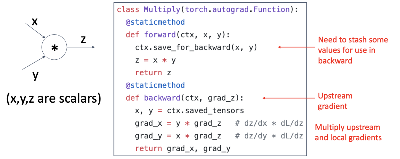 이미 pytorch에서 연산에 대해 구현해놓은 모듈들이 존재합니다. 예시는 multiply gate에 대해 forward 과정, backward 과정을 구현해 둔 코드입니다.