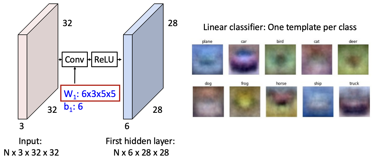 6x3x5x5 필터, 즉 6개의 3x5x5 사이즈의 이미지를 만들어낼 수 있습니다. 이는 Linear classifier에서의 템플릿과 비슷합니다.