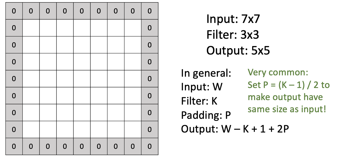 Activation map의 사이즈가 계속 줄어드는 단점을 해결하기 위한 방안으로는 Padding이 있습니다. Padding이란 input 이미지 주변에 0 픽셀을 두르는 것입니다. Padding은 주로 input과 같은 크기의 output을 내기 위해, (K-1)/2로 패딩값을 정합니다. Padding이 있다면 output의 사이즈는 W-K+1+2P로 변경됩니다.