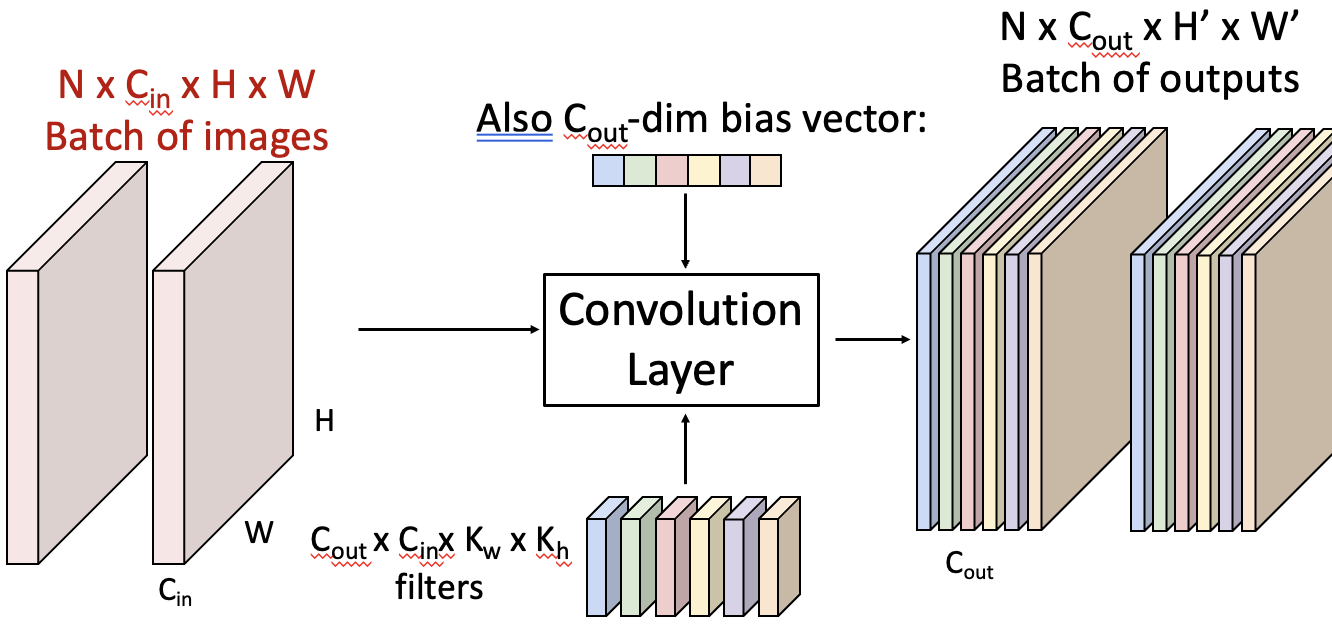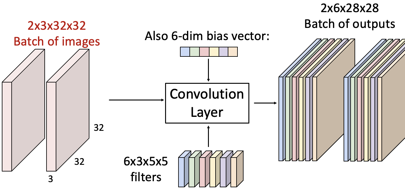 input이 2x3x32x32, filter가 6x3x5x5이면 output은 2x6x28x28이 됩니다. 즉, 일반화하면 다음과 같습니다. (H', W'는 뒤에서 계산하는 방법을 설명할 예정입니다.)