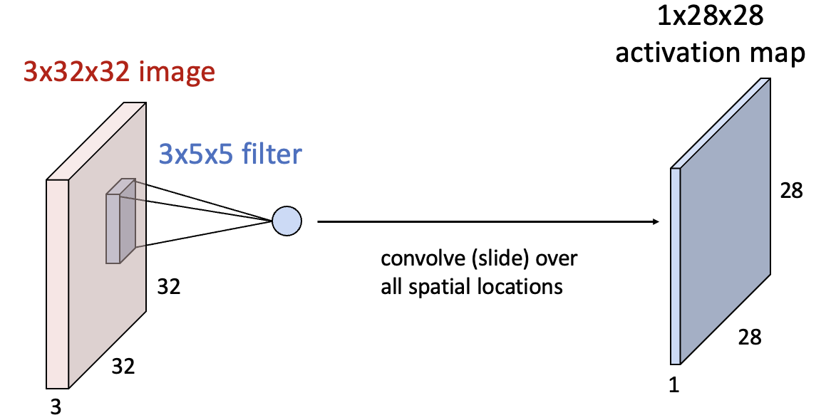 이미지의 일부와 필터의 내적을 하면 scala 값이 나옵니다. 따라서 3x32x32의 input 이미지에 필터를 Convolve하면 1x28x28의 결과가 나옵니다.