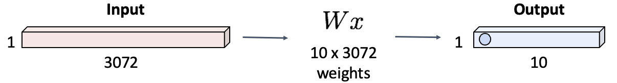 Fully-Connected Layer에서는 input 이미지 데이터(x)를 벡터 형태로 펴줍니다. W는 10x3072 사이즈의 weight matrix이고, matrix-vector 곱셈(내적)을 진행하면 10x1의 벡터가 나옵니다.